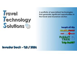 Travel Technology Solutions builds consumer and business technologies that generate significant opportunities for any investor, new tech player and organizations seeking fast entry into the high velocity travel and insurance tech categories. Consistent development and marketing with a well defined roadmap for deployment and scale bring real value and future performance to the table. TTS is a turnkey opportunity and delivers immediate presence into the marketplace.