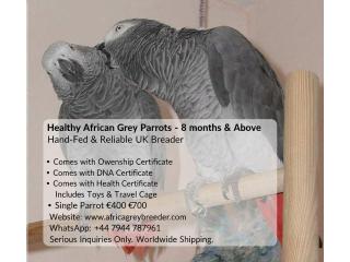 We have beautiful, healthy African Grey parrots available all hand-fed, friendly, and 8 months or older. Each parrot is well-socialized and ready to join a loving home.