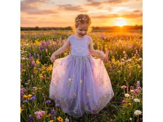 The Lavender Blossom Dress is a dreamy, vintage-inspired gown with soft bohemian elegance. Designed in a gentle lavender hue, it features a delicate lace bodice and flowing ankle-length tulle skirt. Subtle floral details enhance its charm, while its lightweight, comfortable design allows ease of movement for special occasions and celebrations.