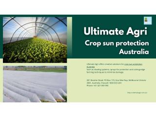 Ultimate Agri offers creative solutions for crop sun protection Australia. Such like shading solutions, sprays to protect and cutting-edge farming methods to minimise the damage. Utilising these solutions, farmers can increase the crop's resilience and improve the quality of their harvest and assure constant growth, which will ensure longevity in the field of agriculture, even in extreme weather conditions. Protecting crops the crops from UV as well as heat are vital for ensuring the quality of your crops. Farmers often face problems such as sunburn, heat stress and less productivity during summer.