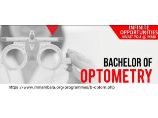 Bachelor of Optometry at MMU Ambala https://www.mmambala.org/ focuses on the comprehensive study of eye health, covering diagnosis, treatment, and preventive measures for a range of ocular conditions. The program aligns with Ministry of Health guidelines and offers diploma holders in Optometry lateral entry into the third semester of the degree course. Students receive extensive training in both theoretical knowledge and clinical practice, equipping them to handle disorders such as Cornea diseases, Glaucoma, Low vision issues, and Retinal ailments effectively. This prepares graduates for fulfilling careers in optometric practice with a solid foundation in eye care.